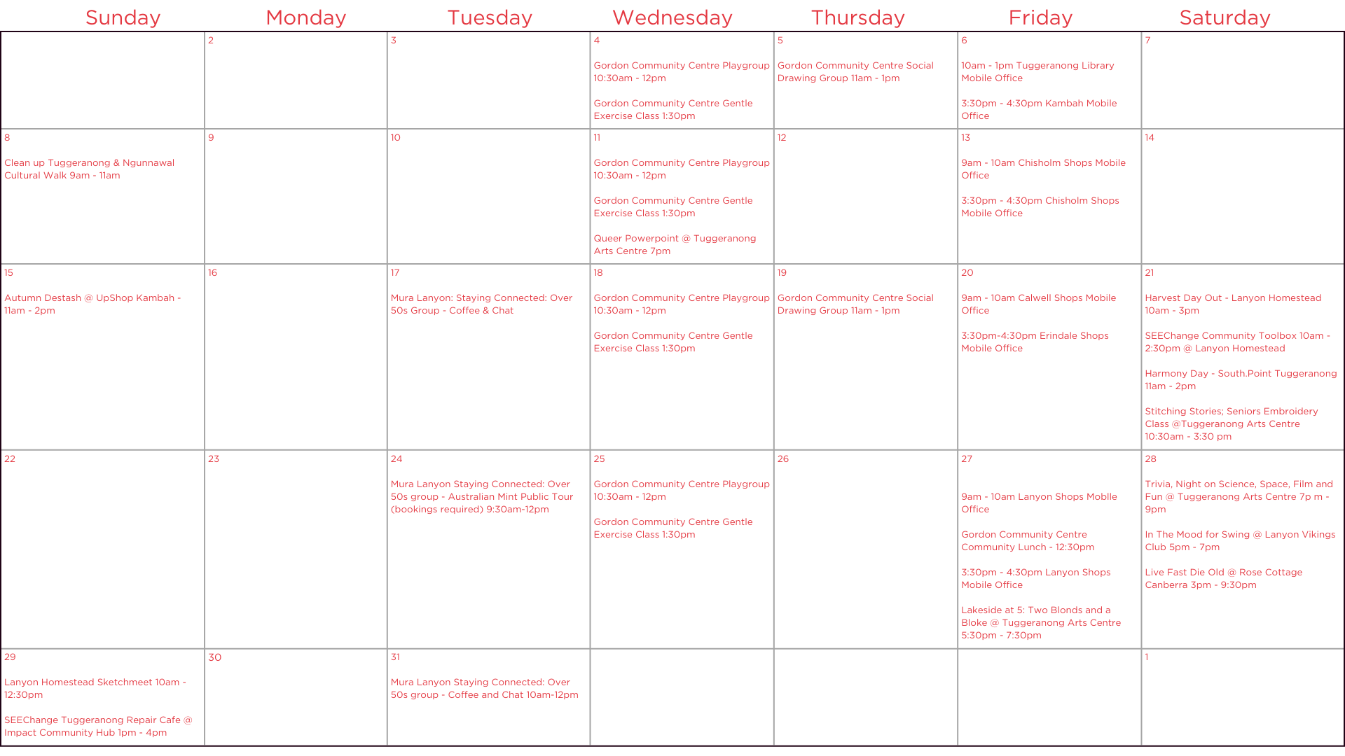 There’s always something happening in our community, and you can find many of these events on my community calendar. If you’d like your organisation’s event included, just send me an email and we’ll work together to add it.